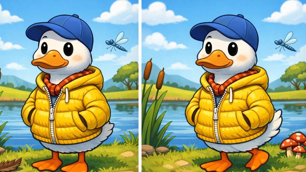 If you like optical illusions and brain teasers then this puzzle is perfect for you. We have created a Spot the Difference challenge that will test how well you notice details & how fast you can think. This visual puzzle shows a cute duck wearing sunglasses and a jacket walking by a peaceful pond. The challenge is to find three small differences between two pictures that look almost the same. Can you find them in just 8 seconds? Only people with very sharp eyes will succeed in time!